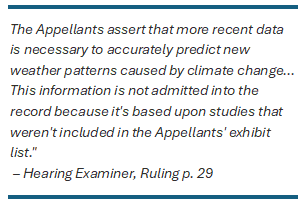 I’m not “aware of any jurisdiction that has as yet attempted to impose more than required by its stormwater standards through SEPA on the sole basis of climate change.” Examiner Ruling, p. 3, footnote 3 | Incorrect. Multiple Washington jurisdictions already voluntarily use CIG climate data for stormwater planning (Thurston, King County and Tacoma) "Lack of awareness" is not a defense for ignoring BAS. WAC 197-11-080 requires obtaining essential risk info (e.g., flooding) if feasible. |